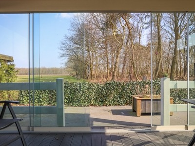 - Buiten: Overdekte veranda met glazen schuifwand, tuinmeubilair en uitzicht op de natuur.