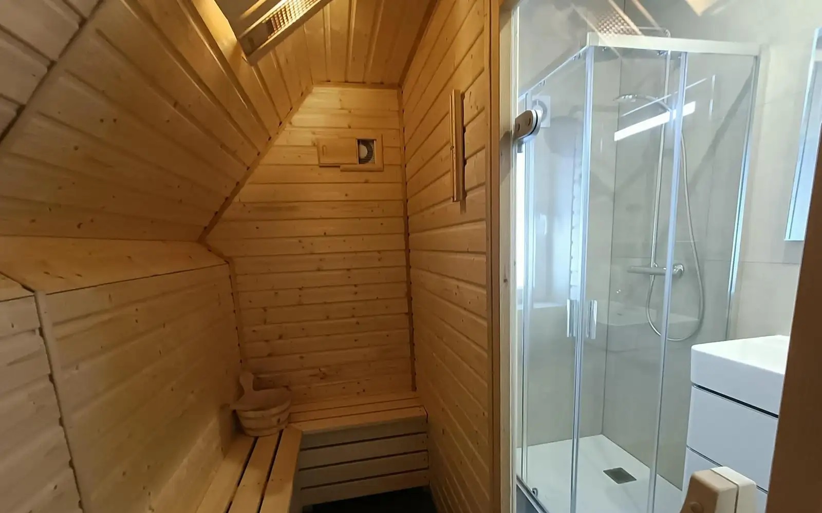 - Buiten: Uitgestrekte tuin met een terras, tuinmeubilair, hottub en toegang tot een traditionele sauna voor twee personen.